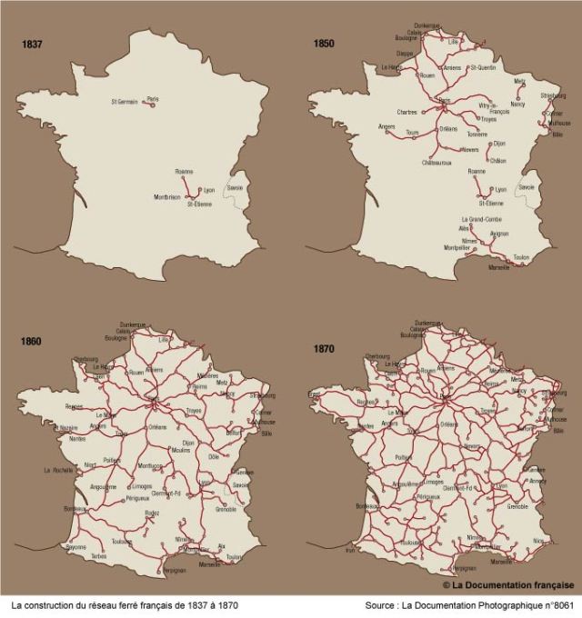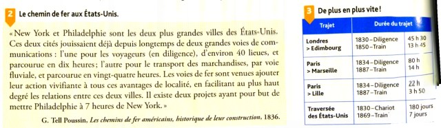 Ex : =>Paris Lille se faisait en 22h en diligence en 1834 et passe à 3h50 en train en 1887.