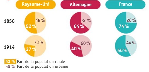 La population rurale a fortement diminué et la population des villes a augmenté. Exemple en France en 1850, 74 % de la population vit à la campagne et elle n’est plus que 56 % en 1914.