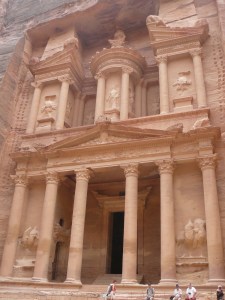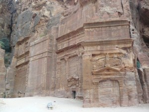 Nous marchons jusqu’au Trésor « Al-Khazneh » qui est souvent la seule merveille que les touristes voient en arrivant à Pétra sans aller plus loin. C’est la scène mythique du film américain dont je parlais plus haut. La place est bondée pour voir ce tombeau d’un roi nabatéen haut de 43 m et de 30 m de large construit au Ier siècle.. Même si nous ne pouvons entrer à l’intérieur, on admire la façade sculptée dans la roche rose. Des bustes de cavaliers se devinent entre les colonnes. La légende raconte que le trésor de ce roi était caché dans ce tombeau, d’où le nom qui lui a été attribué.