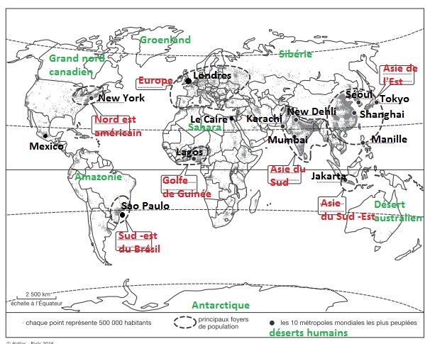 Planisphère avec les principaux foyers de population, les déserts humains et les 10 plus grandes métropoles mondiales