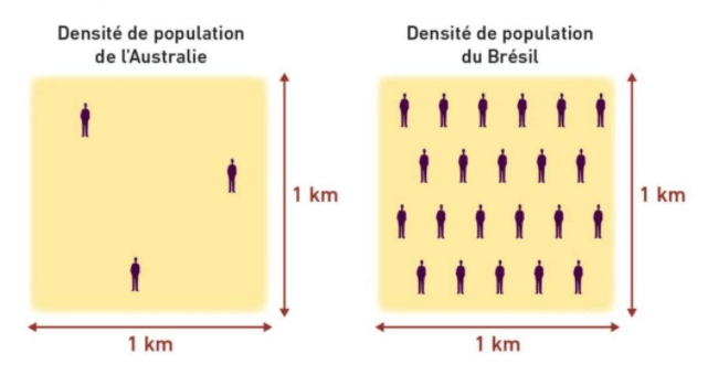 Brésil : 212 000 000 habitants et une superficie de 8 547 877 km2=> 24 habitants par Km2